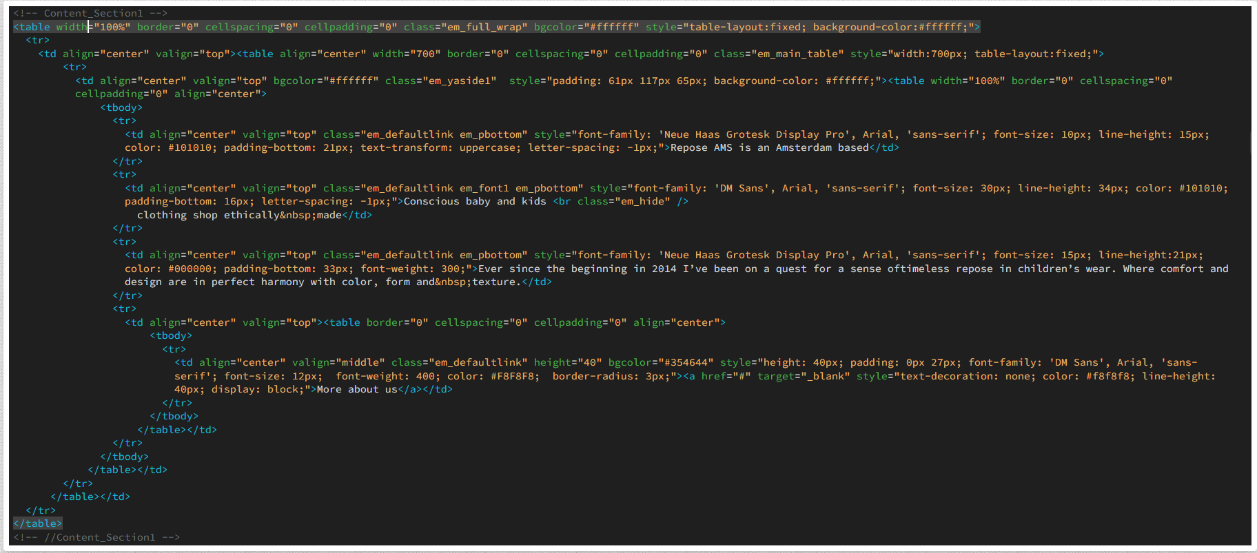 The text blocks are styled to convey brand messaging, using font size, letter spacing, color, and text-transform to create visual hierarchy. The section ends with a CTA button built using a styled <a> tag inside a table cell, with padding, background color, border radius, and block display to maintain its button-like appearance across even restrictive email clients.