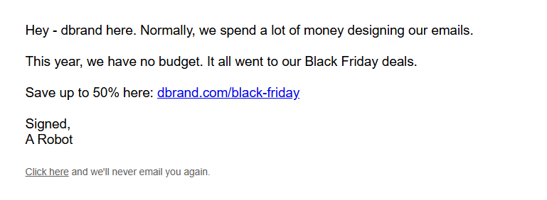 Dbrand is one of our favorite brands when it comes to email marketing. They’re a great bunch of storytellers. This email is just one example of their genius.