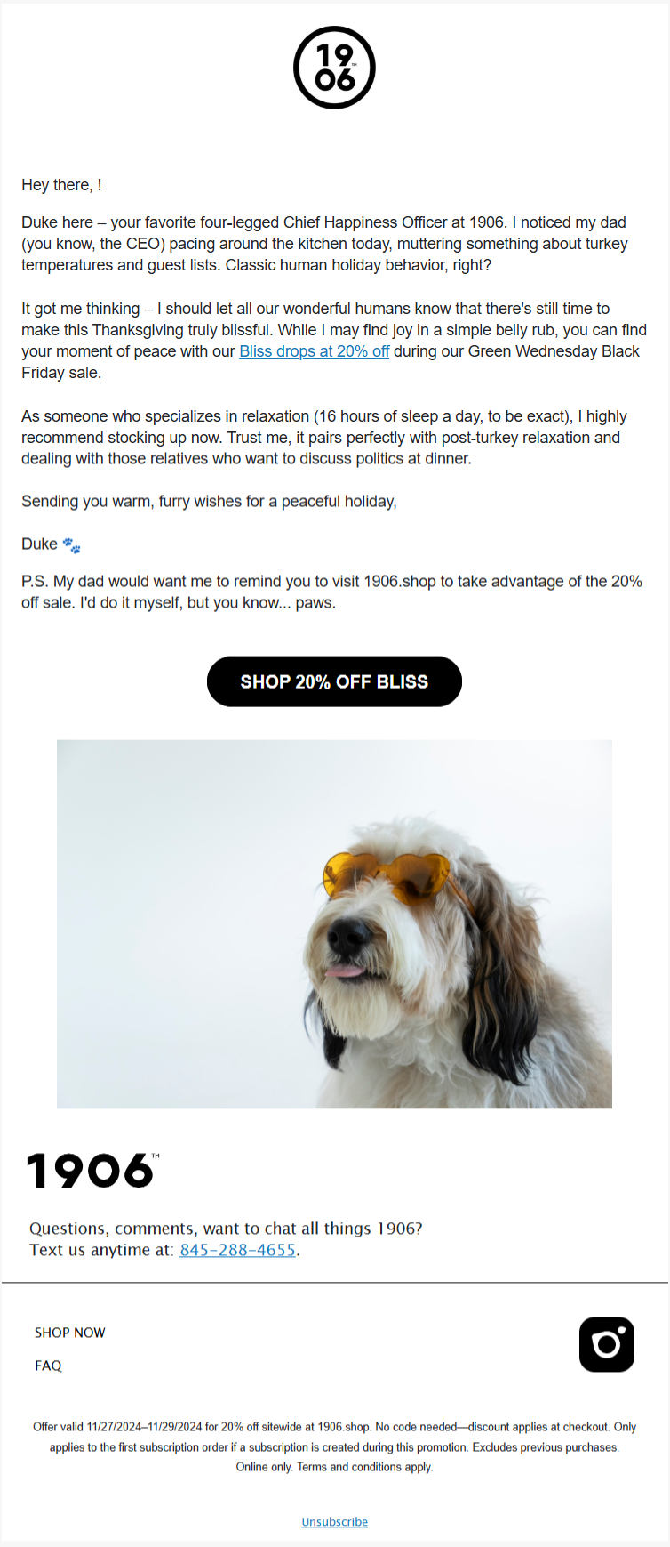 By writing from the dog’s perspective, 1906 transforms their standard holiday promotion into character-driven storytelling. Through Duke’s playful commentary on “classic human holiday behavior,” the brand connects the product to a relatable seasonal tension: Thanksgiving stress.